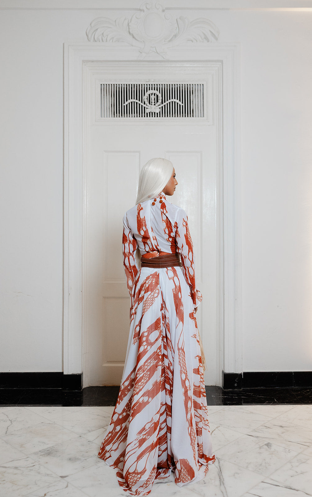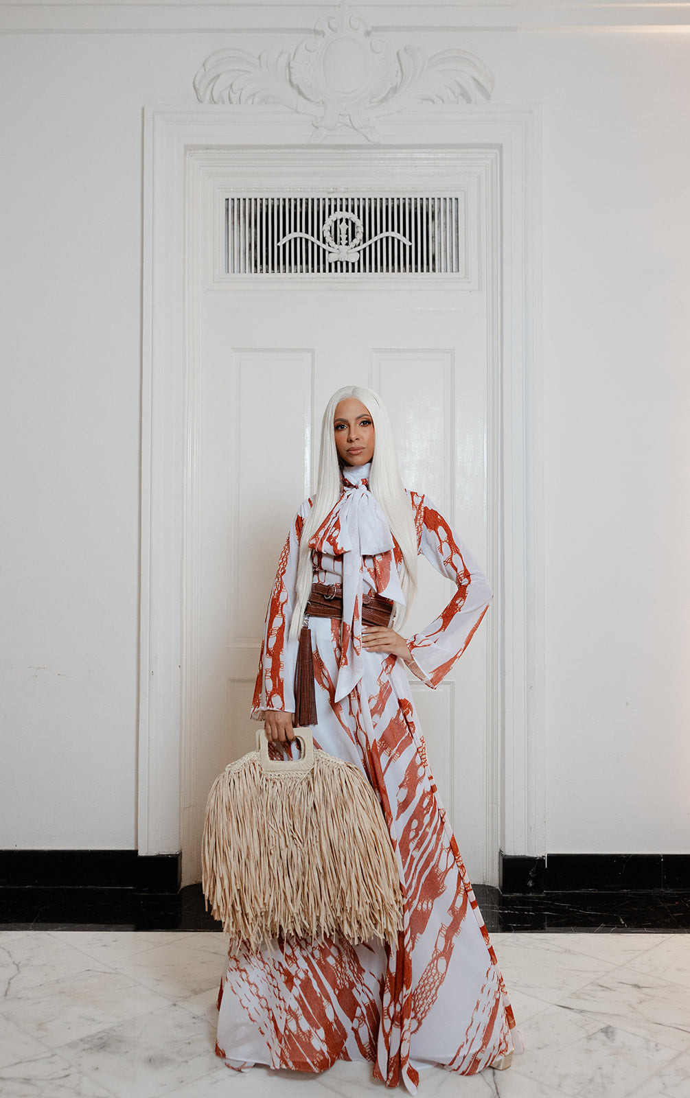 This two-piece ensemble features a bow-tie blouse and a full circle skirt, both crafted in our exclusive print, designed to enhance your silhouette with effortless movement.