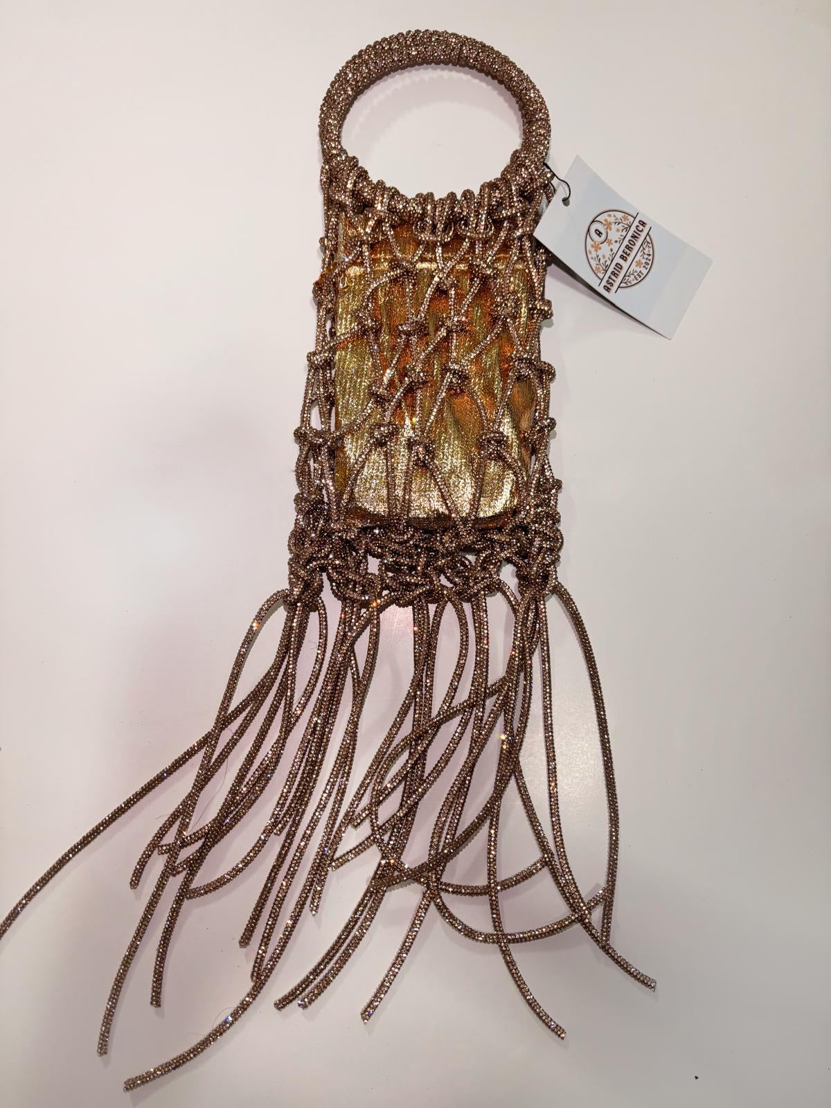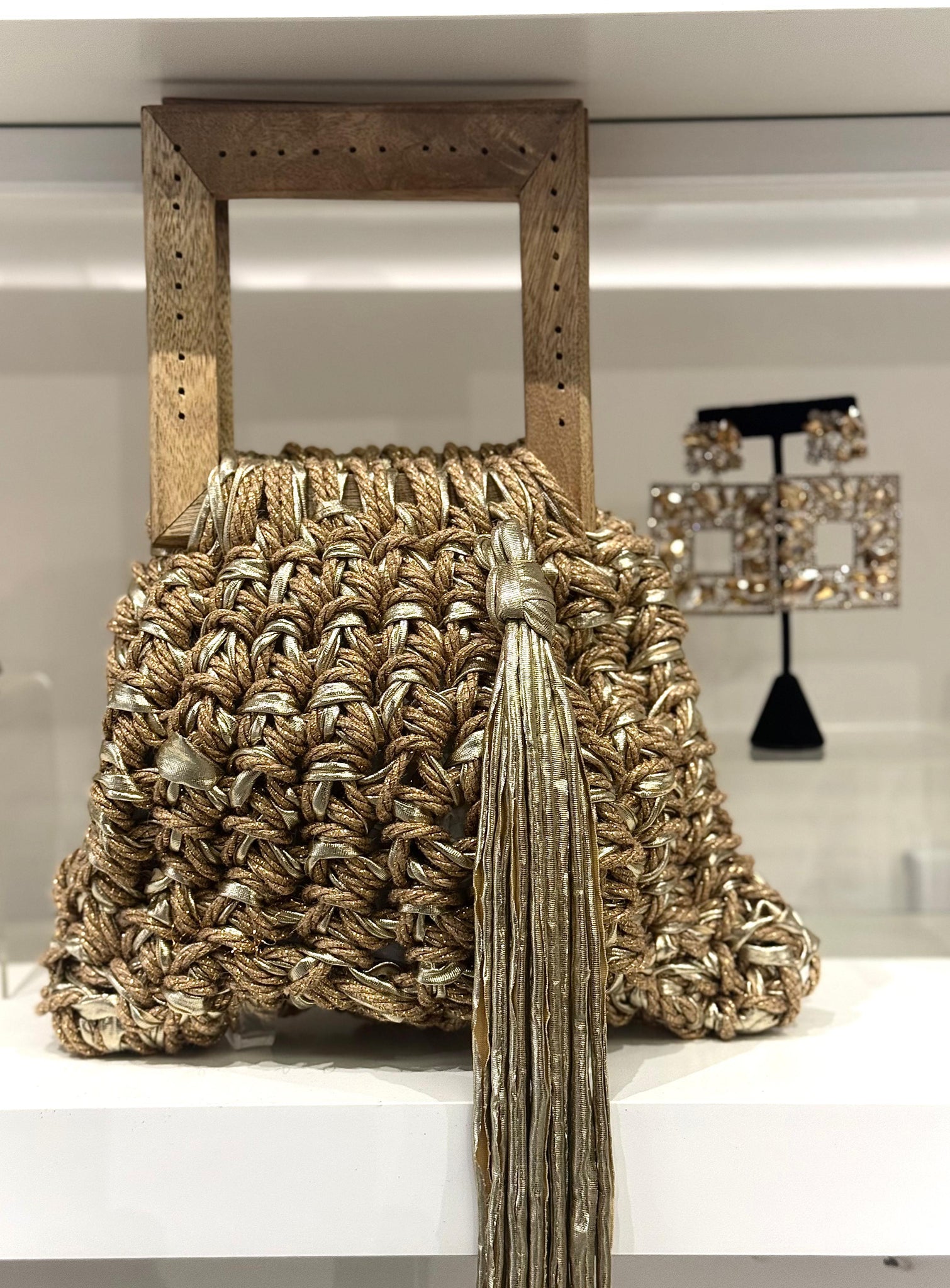 Crafted by hand with Italian-sourced vegan raffia and /or braided cotton yarn, finished with subtle shimmering details for a touch of glamour and elegance.