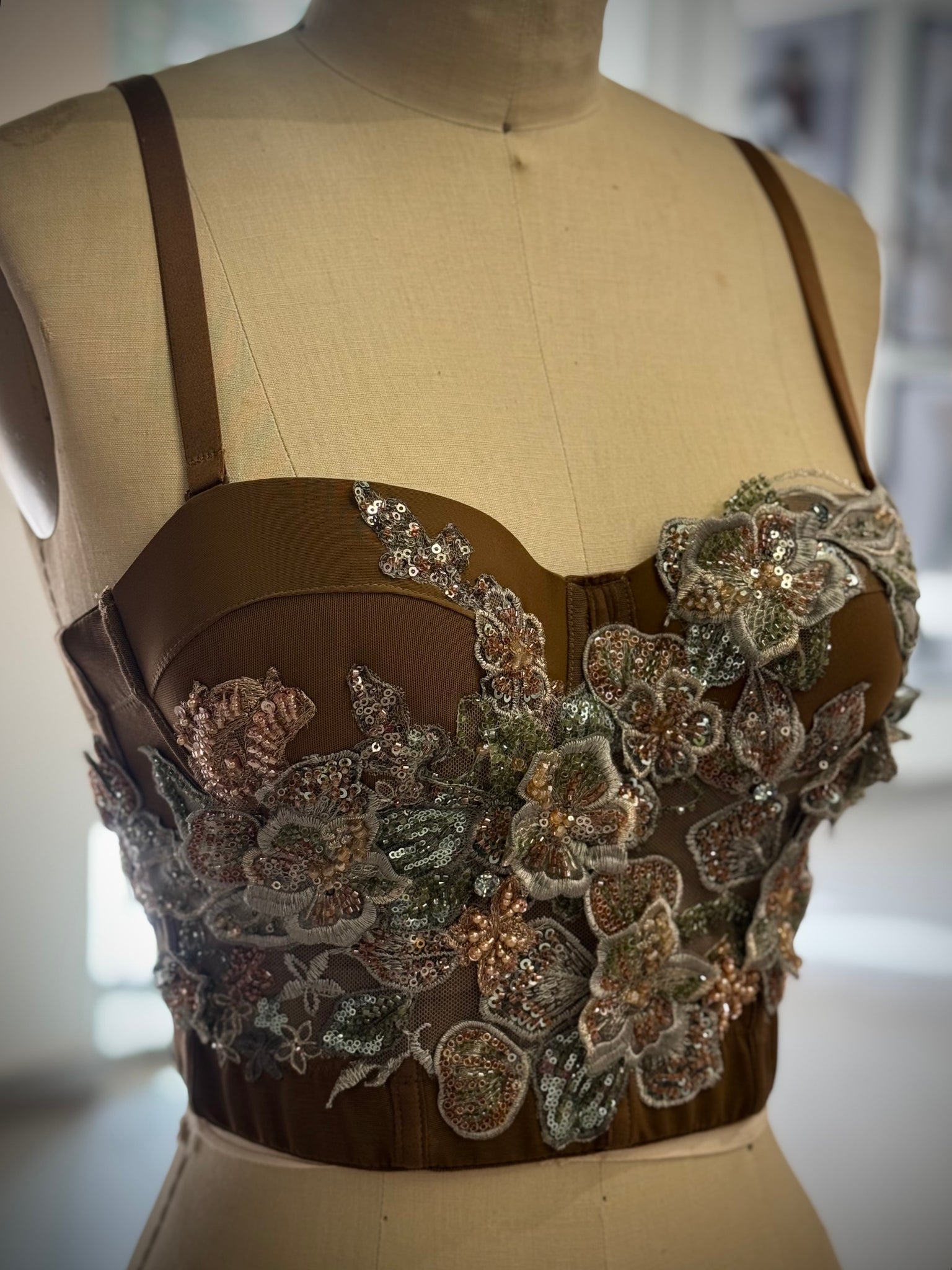 Bustier en tono brown profundo, realzado con apliques artesanales en tonos moss green y acentos multicolor que aportan textura, contraste y un aire orgánico sofisticado. Una pieza statement que equilibra fuerza y delicadeza, ideal para elevar cualquier look de noche o combinar con faldas y pantalones de silueta limpia.