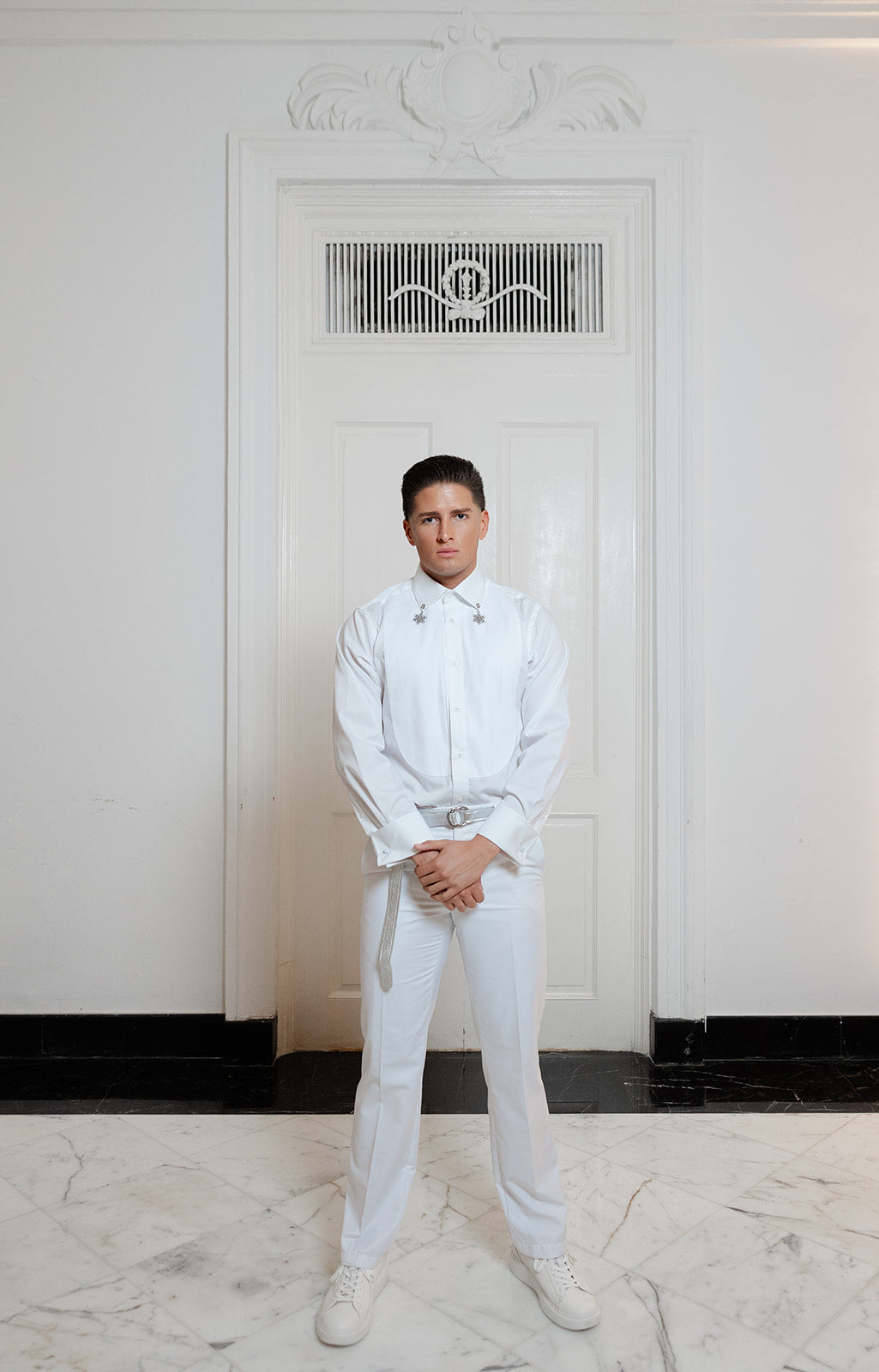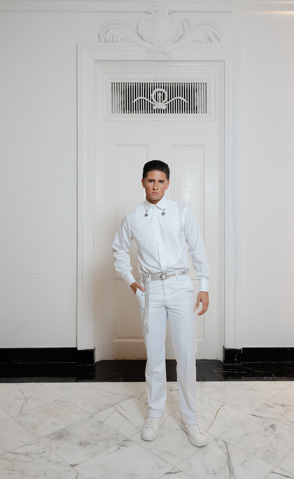 Camisa blanca de estética minimalista con delicados detalles de amuletos o accesorios que aportan un acento contemporáneo y sofisticado. Su silueta pulida y el contraste sutil del metal transforman una pieza clásica en un statement moderno, ideal para quienes buscan elegancia con carácter.