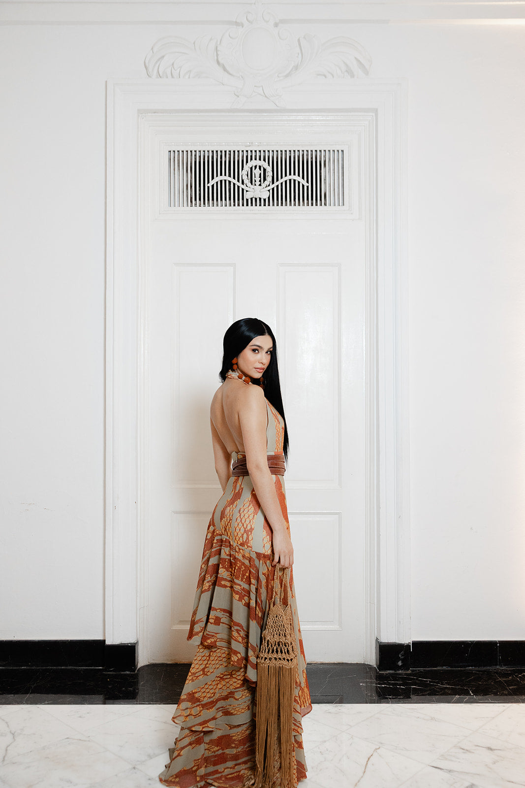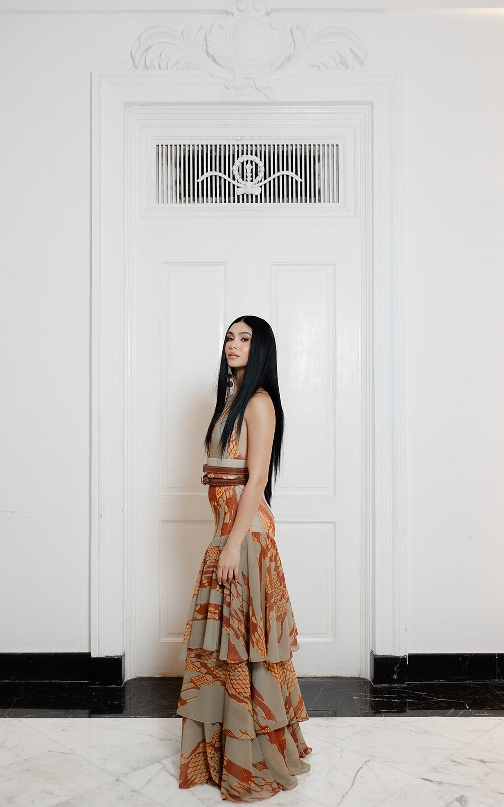 Inspirado en los tonos tierra y el movimiento orgánico, este vestido halter combina neopreno estructurado con chiffon etéreo estampado. Una silueta que fluye con gracia y carácter, pensada para mujeres que buscan una propuesta contemporánea con esencia artística.