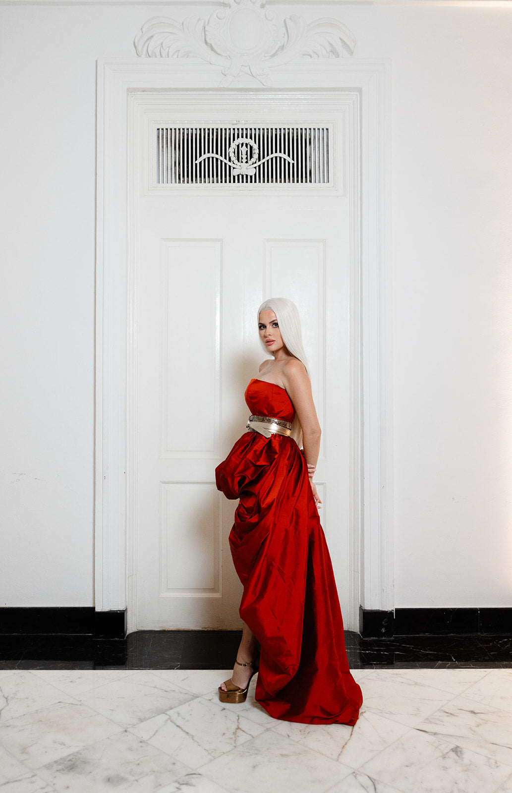 Un set color terracota que juega con la estructura y el movimiento de forma elegante y contemporánea. El top strapless de corte recto aporta una silueta limpia y sofisticada, mientras la falda bubble corta-larga crea volumen, dinamismo y un contraste visual impactante.