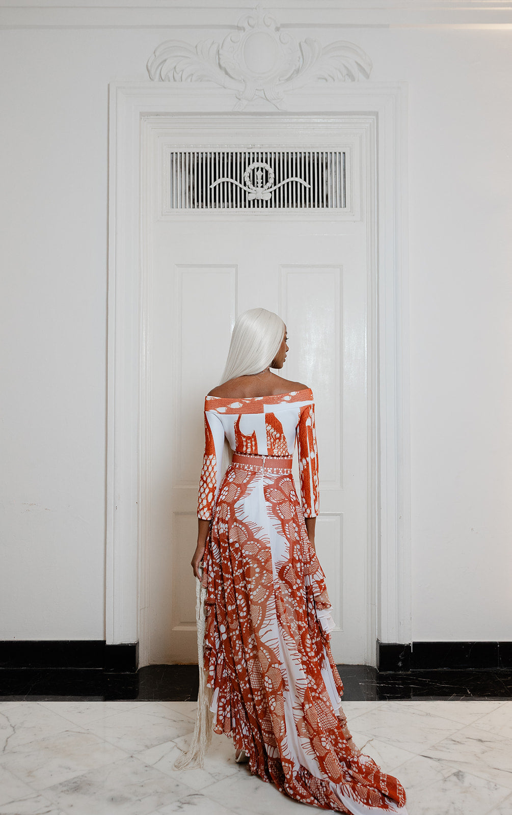 Una creación en print exclusivo color terracota, diseñada para destacar desde la primera mirada. Su top off-shoulderenmarca los hombros con elegancia sutil, mientras la falda high-low con volantes aporta movimiento, dramatismo y una silueta fluida que juega con las proporciones.